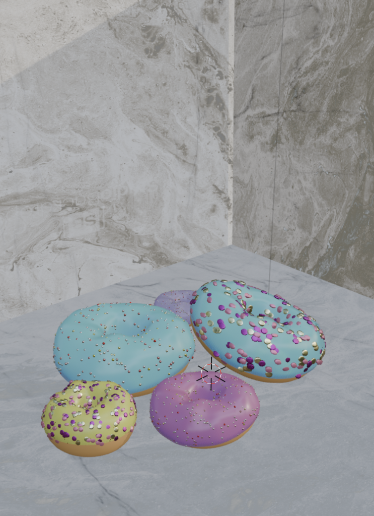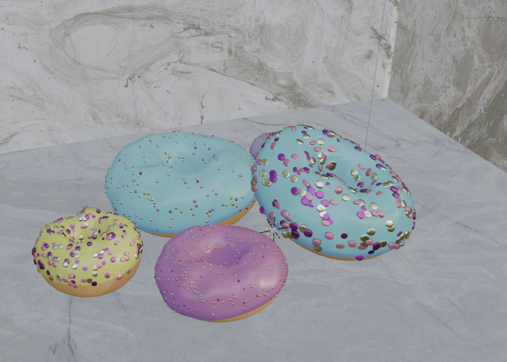 - Two pictures for 3D Donuts with particles- Excercise for home- created in Blender- the first project in Blender- to better unterstand Blender and learn the tools